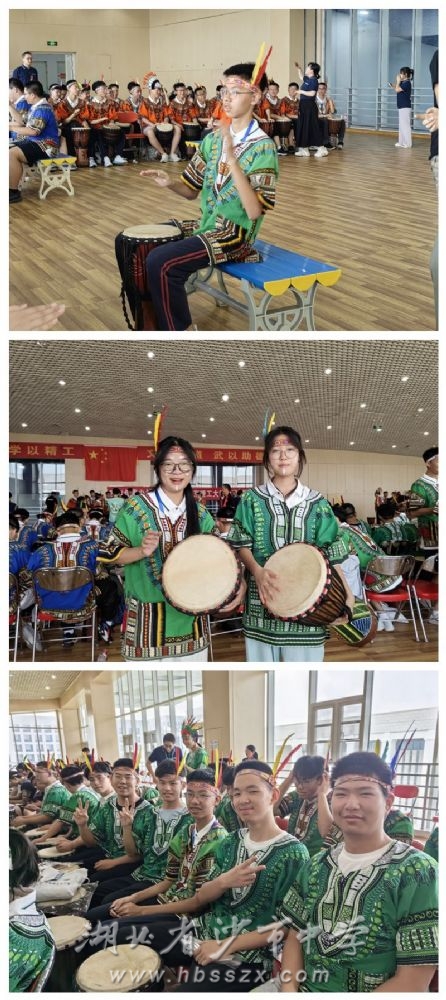 “鼓舞飛揚”素質拓展活動 下午,學子們參加“鼓舞飛揚”素質拓展活動。非洲鼓專業老師以幽默風趣的語言打破同學之間的沉默,以鼓點節奏來鼓舞人心。在掌握非洲鼓技巧之后,大家換上了特色服飾,畫好自己心儀的妝容,通過激昂的鼓點聲、優美的舞姿一起表演了“鼓舞飛揚”令人難忘的展演。