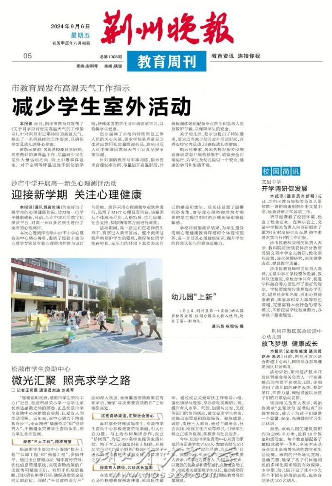 《荊州晚報》2024年9月6日報道我校關注學生心理健康