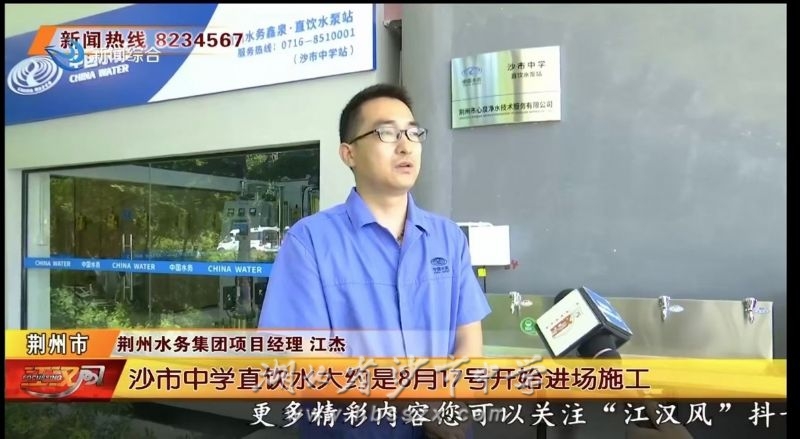 “江漢風”節目報道沙市中學直飲水項目 為進一步提高師生的飲水質量,沙市中學攜手水務集團共同打造校園管道直飲水項目。直飲水項目于暑期開始施工,開學初施工結束,經過一周的測試后于9月9日正式運行。