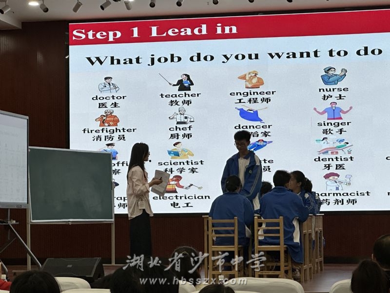 沙市中學(xué)英語教師與荊州市教科院英語教研員陳媛媛合影 本次比賽采取“現(xiàn)場答題+教學(xué)設(shè)計(jì)+現(xiàn)場教學(xué)+現(xiàn)場說課”的形式。邵鳳鳴老師的教學(xué)圍繞一篇給定材料的續(xù)寫任務(wù)展開,材料講述了一位剛高中畢業(yè)的學(xué)生在選擇職業(yè)道路時(shí)的困惑,通過在銀行和醫(yī)院的實(shí)習(xí)經(jīng)歷進(jìn)行對比,在醫(yī)院實(shí)習(xí)快結(jié)束時(shí)發(fā)生了一起意外事件。她先帶領(lǐng)學(xué)生閱讀材料,提取關(guān)鍵信息。再幫助學(xué)生對材料進(jìn)行分析,提出合理問題并進(jìn)行邏輯回答,為續(xù)寫做準(zhǔn)備。學(xué)生們在續(xù)寫故事中展現(xiàn)了一定的創(chuàng)造力和邏輯思維能力,能夠根據(jù)給定材料合理預(yù)測情節(jié)發(fā)展。通過對不同職業(yè)的對比描寫,學(xué)生對職業(yè)選擇有了更深入的思考。