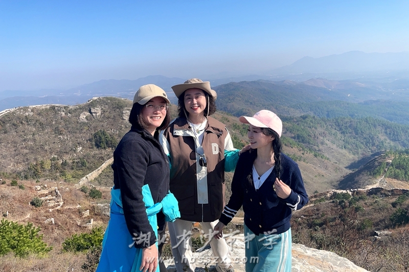 為了尋覓一個最佳視角,我們爬到山頂鳥瞰全景。站在龍王尖頂極目遠眺,連綿的山脈盡收眼底,彩葉點綴在山澗,和風拂面,令人心曠神怡。大家紛紛拍照留念,記錄下這一難忘的瞬間,也將母校情、校友情與眼前的美景一同定格。