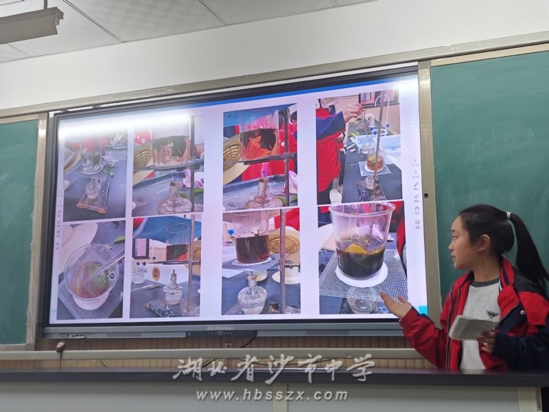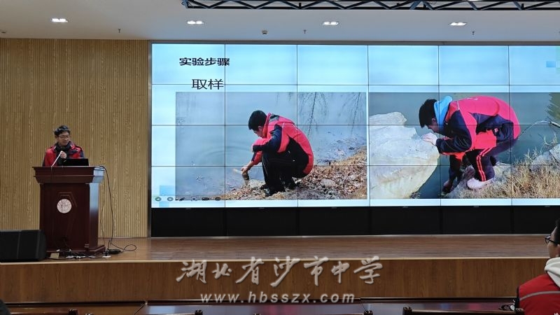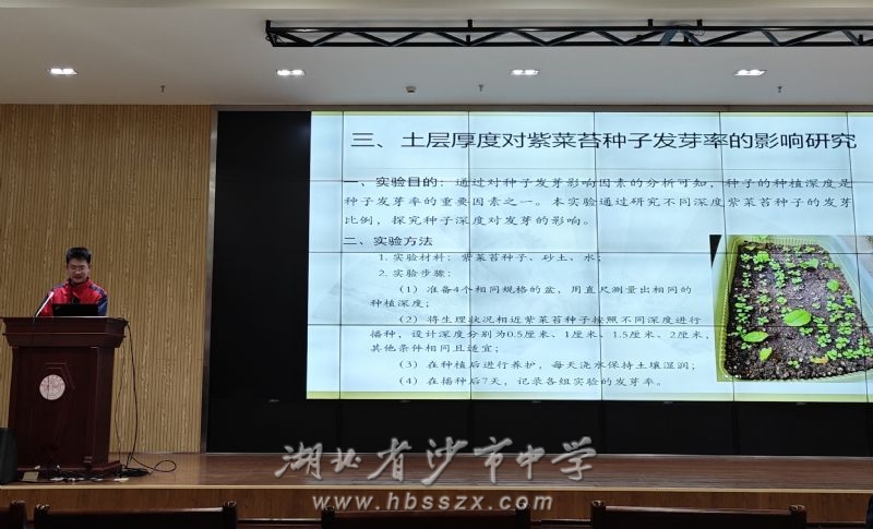 生物教研組集思廣益,開展了百草園植物辨認、制作葉脈書簽、探究習坎湖水質凈化、探究非生物因素對紫菜苔種子發芽率的影響四大活動。各班學習小組將整個實踐探究過程擬寫成實驗報告,在報告會現場,小組代表分享研究成果和集體智慧。