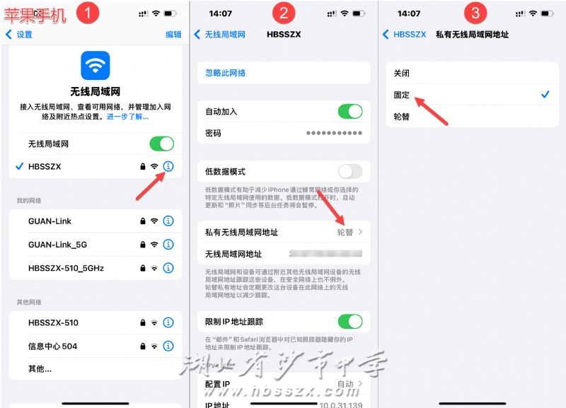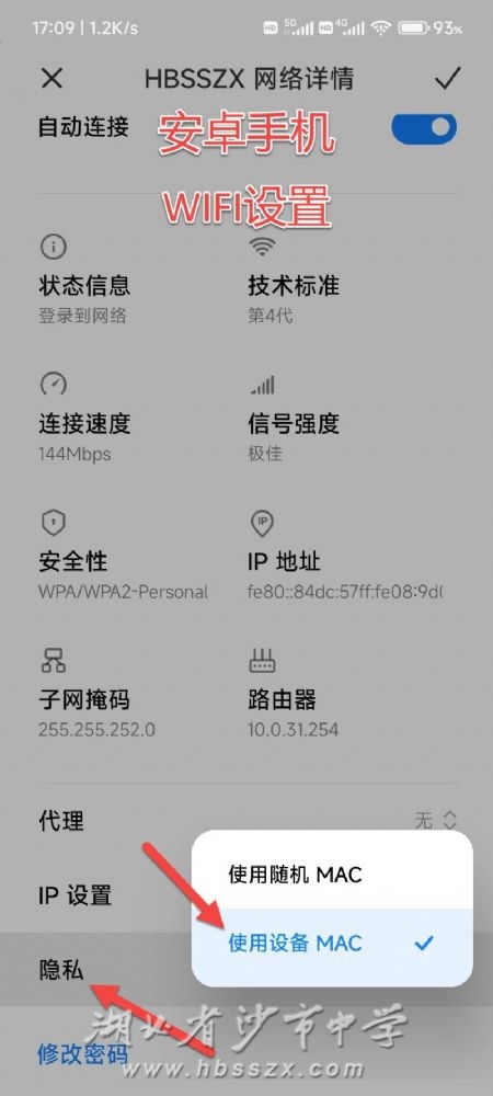 通過(guò)沙市中學(xué)校園網(wǎng)上網(wǎng)的個(gè)人用戶設(shè)備,一律實(shí)行實(shí)名認(rèn)證。用戶設(shè)備首次上線時(shí),系統(tǒng)自動(dòng)進(jìn)行 MAC 地址(即私有無(wú)線局域網(wǎng)地址)綁定。綁定的 MAC 地址累計(jì)超過(guò)一定數(shù)量時(shí),對(duì)新上網(wǎng)設(shè)備拒絕連接外網(wǎng)。目前,大多數(shù)移動(dòng)上網(wǎng)設(shè)備(指通過(guò)無(wú)線上網(wǎng)的手機(jī)、平板電腦等),默認(rèn)采取動(dòng)態(tài)或隨機(jī) MAC 地址的方式連網(wǎng),以便對(duì)設(shè)備進(jìn)行隱私保護(hù)。這一機(jī)制與上網(wǎng)認(rèn)證機(jī)制有一定的沖突,表現(xiàn)為用戶登記的 MAC 地址數(shù)量在短期內(nèi)會(huì)突破上限,導(dǎo)致很快被系統(tǒng)拒絕登錄。為避免這一沖突,用戶需將登錄校園網(wǎng)的無(wú)線連接項(xiàng)(僅指連接“HBSSZX”WIFI 的項(xiàng)目)設(shè)置為“固定 MAC 地址”(或選“關(guān)閉”)才能長(zhǎng)期穩(wěn)定連接校園網(wǎng),設(shè)置方法見(jiàn)下圖。