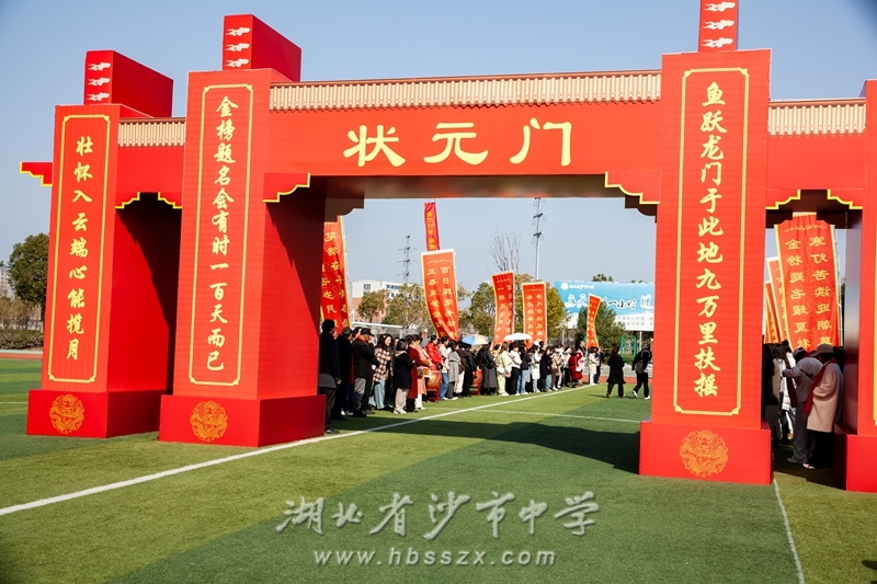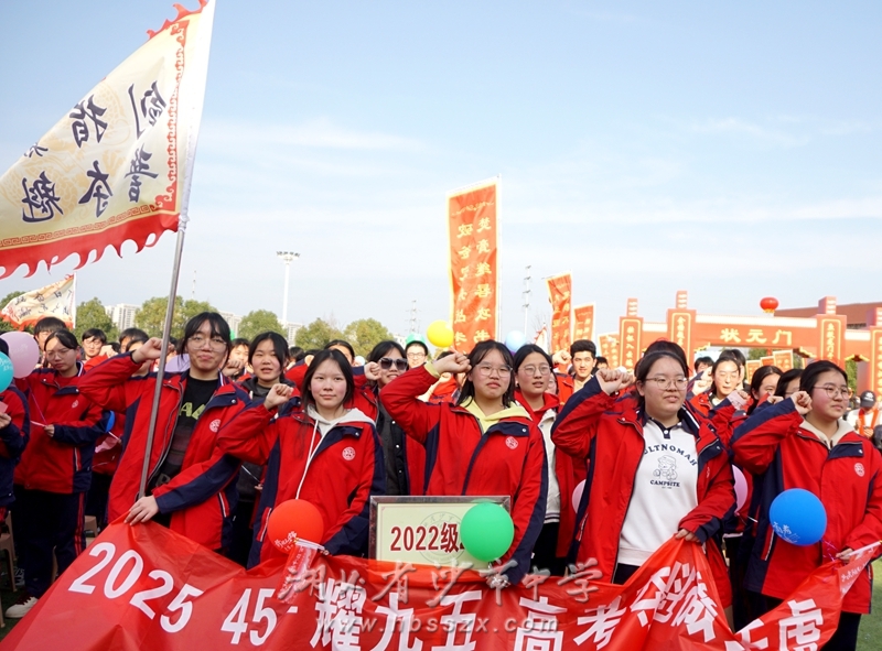 操場四周,勵志標語高懸,手持勵志牌的學生們目光堅定;主席臺前,“狀元門”巍然矗立,對聯(lián)“壯懷入云端心能攬月,豪氣沖霄漢手可摘星”“金榜題名會有時一百天而已,魚躍龍門于此地萬里扶搖”彰顯著學子們的豪情壯志。遍布四周的勵志標語、彩球、加油手幅、戰(zhàn)鼓、班旗……這些精心布置道具,如同奮進的火焰,點燃了現(xiàn)場每一個人的熱情。