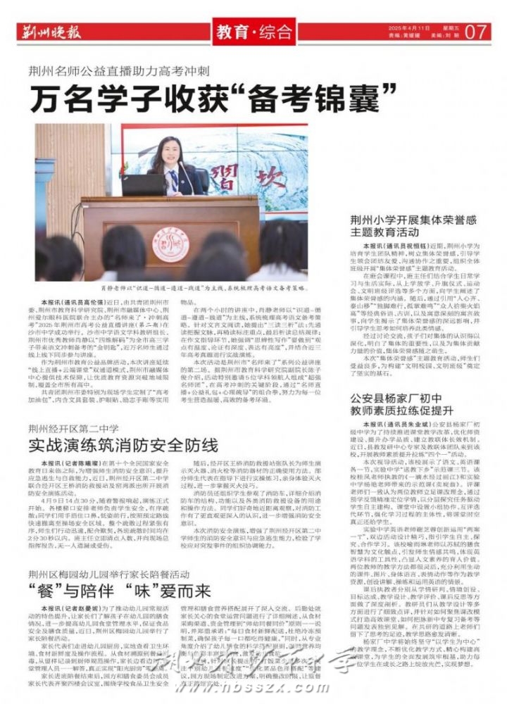 《荊州晚報》2025年4月11日報道我校肖靜老師主持2025年荊州名師公益直播活動