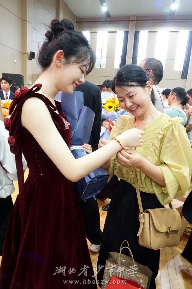學生代表向家長代表獻花后,全場迎來最溫情的時刻——家長為孩子送上象征成人的“成人卡”,卡片上或寫著父母的叮嚀,或封存著成長的照片;孩子們則雙手捧上精心準備的禮物,有的是一束花,有的是一份手工制品,隨后深深鞠躬,向父母致以最崇高的敬意。當《是媽媽是女兒》的旋律響起,家長與孩子互贈信件,現場閱讀,有的默默拭淚,有的緊緊相擁,千言萬語化作無聲的愛意,在彼此心中流淌。