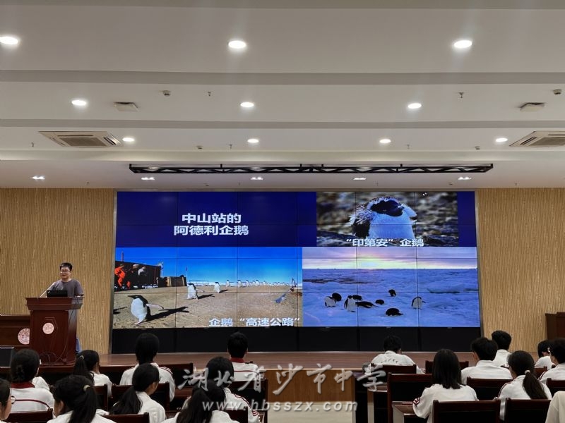 活動特邀上海師范大學教授張少華作南極科考專題報告。張少華老師以《我親歷的南極考察》為題,用第一視角揭開南極科考的神秘面紗,通過分享豐富的視頻、圖片等資料,介紹了南極大陸的自然風光,展現了我國40年來在南極考察中取得的輝煌成就,并講述了南極考察的親身經歷,將科學探索的艱辛與浪漫娓娓道來。現場學生全神貫注,全程緊盯屏幕,氣氛活躍熱烈。
