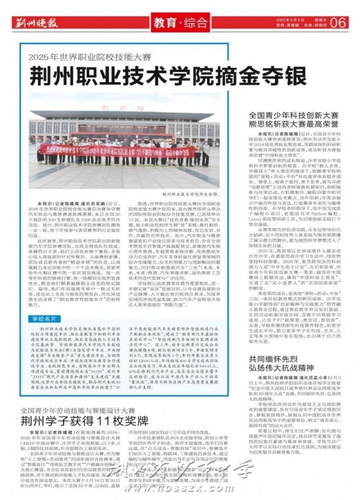 《荊州晚報》2025年9月5日報道我校熊思銘同學斬獲全國青少年科技創新大賽最高榮譽