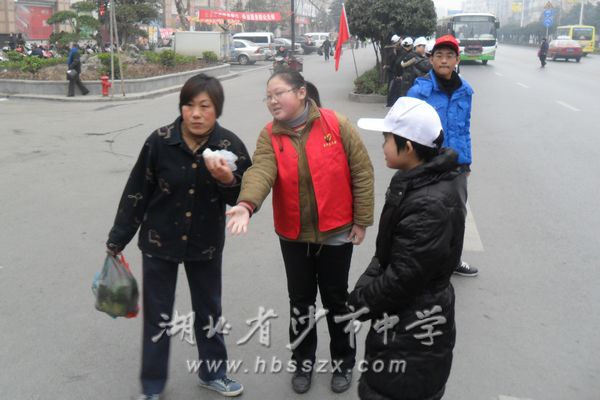 早上8點半,高一(2)班學(xué)生在校園門口整裝待發(fā),班主任李雪冰老師向同學(xué)們強(qiáng)調(diào)了安全問題及相關(guān)的注意事項,團(tuán)委書記張珺老師給同學(xué)們講述了出行紀(jì)律并分派了任務(wù)。隨后,同學(xué)們分成三組,由李雪冰老師與魏遵平老師帶領(lǐng)第一隊到路況相對復(fù)雜的沙隆達(dá)廣場路口,由張珺老師與劉寒冰老師帶領(lǐng)第二隊到我校對面的路口,由肖一鳴老師帶領(lǐng)第三隊到綠化村菜場路口,分別勸導(dǎo)來往的行人遵守交通規(guī)則,過馬路請走斑馬線。有的市民經(jīng)過我校學(xué)生的勸導(dǎo)立刻停止了橫穿馬路的行為,有的市民對我校學(xué)生的良好素質(zhì)發(fā)出了嘖嘖的贊嘆聲,當(dāng)然也有一些市民對此不理解,但是我校學(xué)生依然耐心解釋、熱心勸導(dǎo)。同學(xué)們在活動中積極主動,熱情大方,勸導(dǎo)行人遵守交通規(guī)則,幫助行動不便的老人過馬路,充分展示了習(xí)坎學(xué)子的優(yōu)良素質(zhì)和精神風(fēng)貌,為雷鋒日增加了一道亮麗的風(fēng)景。[攝影/劉寒冰]