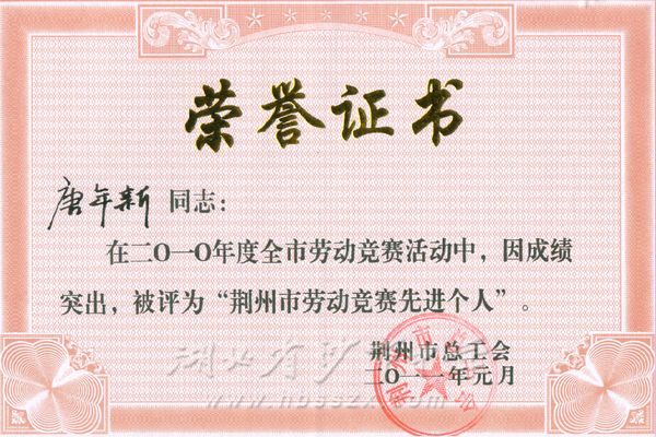 近日,在荊州市總工會主辦的“2010年度荊州市勞動競賽評比”活動中,我校被評為“市勞動競賽先進單位”,唐年新老師被評為“先進個人”。