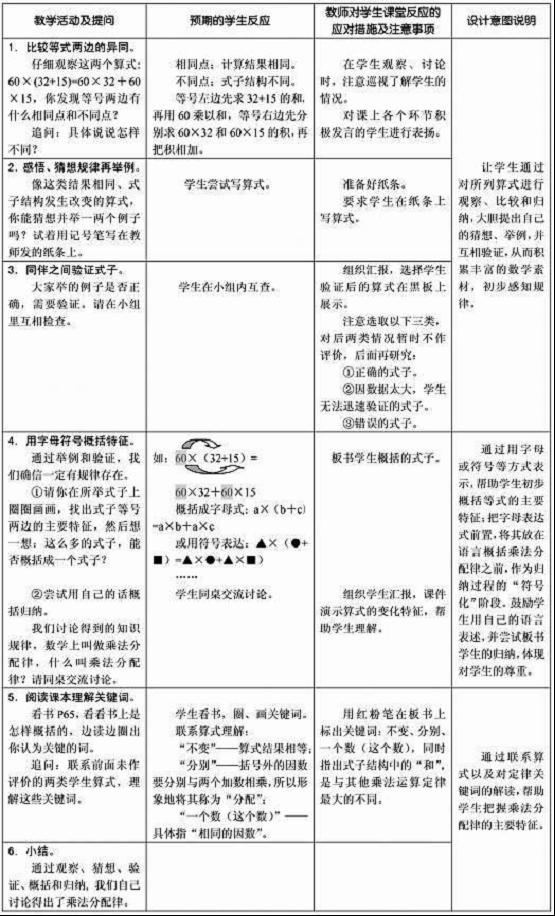 下面是我們的課題組成員在上海市浦東新區白玉蘭小學開展課例研究時,與一位教師共同設計的“乘法分配律”一課教案的一部分②。(見下頁圖表)它在吸收我國教案設計優點的基礎上,對日本的教案模式進行了改造,從而使雙方的優勢得以互補。這一教案片段,旨在引導學生通過探究對乘法分配律的運算定律進行抽象概括。