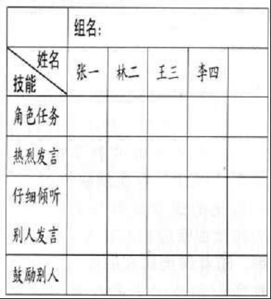 在當(dāng)前的課例研究中,觀察量表的使用較為廣泛。觀課教師在確定觀察點(diǎn)后,就可以結(jié)合自身的實(shí)踐經(jīng)驗(yàn),獨(dú)立或合作開(kāi)發(fā)觀察量表,而后進(jìn)入課堂,并在試用中不斷加以修正, 最終形成科學(xué)的觀察工具。比如,觀課教師想了解學(xué)生的合作討論技能,就可以設(shè)計(jì)下列觀察量表,通過(guò)記錄技能的頻次了解小組成員對(duì)合作討論技能的理解與運(yùn)用狀況,并據(jù)此對(duì)每個(gè)小組提出有針對(duì)性的建議。