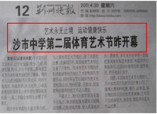 據沙市中學副校長趙文華介紹,與上屆體育藝術節相比,除了豐富的比賽、表演項目外,本屆體育藝術節還注重了開放性。在體育藝術節期間學校將邀請荊州市知名藝術家和演員參加活動,同時將在節后組織傳統文化進校園活動,荊州民歌、花鼓戲、鼓盆歌和京劇等傳統藝術進入課堂。