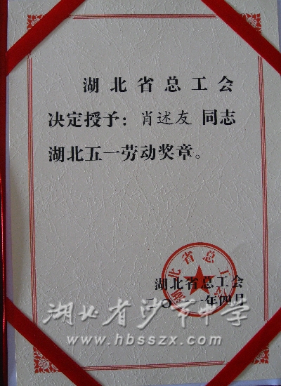 “五一”國際勞動節來臨之際,沙市中學教師肖述友獲得湖北省總工會頒發的“五一勞動獎章”。