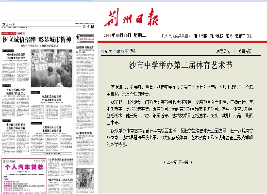 沙市中學舉辦第二屆體育藝術節 本報訊(記者吳丹)近日,沙市中學舉辦了第二屆體育藝術節,為師生提供了一個展示自我,張揚個性的舞臺。