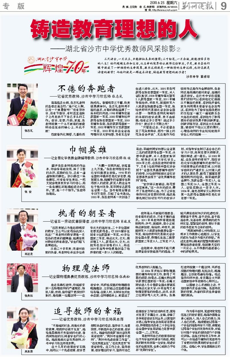 ——湖北省沙市中學優秀教育風采掠影② 三尺講臺,一片沃土,亦能耕耘未來的憧憬;三寸粉筆,一片赤誠,就能演繹多彩的人生!他們超越生存和生活,從生命的境界體認教師這份職業,于是,教書在他們眼中就成了一種獨特的生命現象,教書過程就是一種獨特的生命過程,也許這就是詩意的教學!而他們就是一群追求詩意,鑄造教育理想的跋涉者!