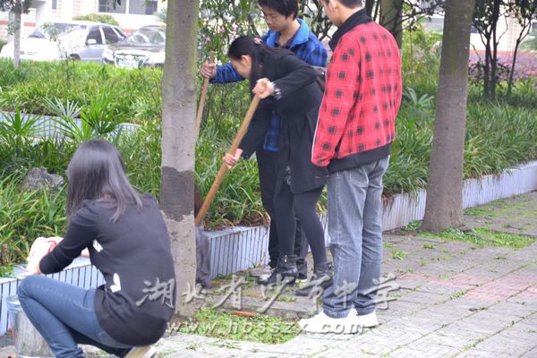 與此同時,高二(15)班的同學在學工處主任吳本萍和班主任胡曉紅老師的帶領下在校園內部開展了校園清潔大掃除活動。同學們分工協作,有的掃道路,有的抹花壇,有的除雜草,將校園的主干道及兩側的綠化帶打掃得煥然一新。