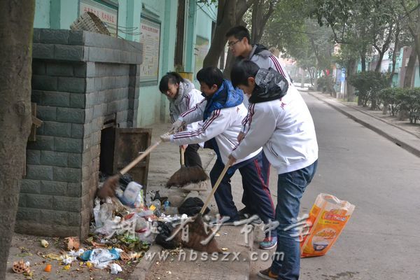 在社區打掃清潔的同學們,雖然手頭的工作不累,但是由于是在戶外勞動,而且又是寒冬的清晨,天氣特別地寒冷,然而他們不懼嚴寒,不怕辛苦,操起掃帚、拖把、水桶、鏟子等工具,在花壇上、道路邊,一絲不茍地開始了勞動。他們的笑臉映著初升的旭日顯得格外地燦爛而充滿朝氣。綠化村社區的鄧主任說,這幫孩子真是不錯,這樣冷的天氣真正地磨煉了他們的意志,我對他們的表現非常的欣喜和滿意。
