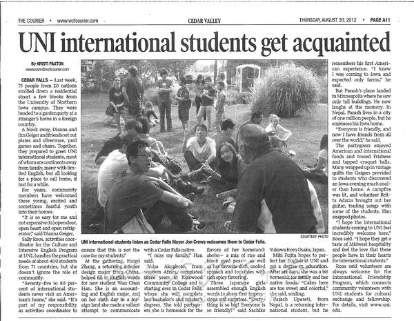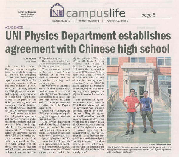 我校2010級高二(1)班紀超同學被美國北愛荷華大學物理系錄取后,于8月5日到達該校。由于紀超同學的優異成績和表現,當地報紙和北愛荷華大學校報對北愛荷華大學與湖北省沙市中學簽訂合作協議,招收沙市中學學生事宜進行了專題報道。