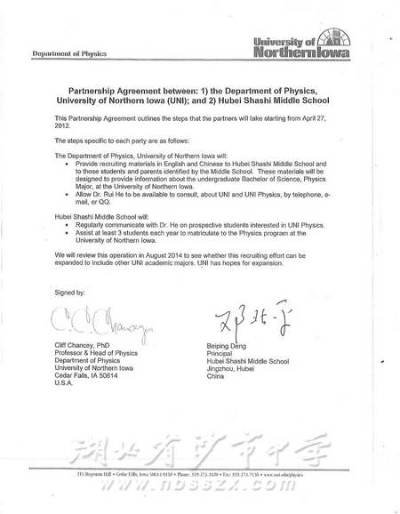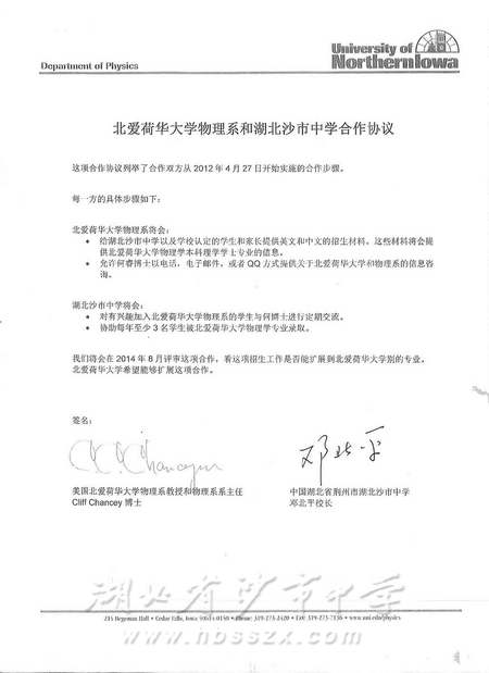 經過校友的介紹,學校對外交流處與美國北愛荷華大學物理系主任、知名教授等進行了遠程視頻交流,特別是紀超同學親赴美國參加該校筆試和面試,于高二學年就通過了托福考試大關,紀超同學優異的成績和表現,讓北愛荷華大學更加深刻地了解了湖北省沙市中學,了解了湖北省沙市中學的辦學理念。經過雙方最高領導決定,兩校決定簽訂合作協議。協議第一期至2014年為止。經過再次審核后,北愛荷華大學所有專業都校沙市中學開放。