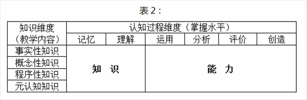 任何學科的學習我們都可以分為兩個維度:一是縱向的知識維度,即教學內容,分為事實性知識、概念性知識、程序性知識、元認知知識;二是橫向的認知維度,即掌握水平,按照從低到高分為記憶、理解、運用、分析、評價、創造六個層面。在此分類系統中,不存在“能力”的概念,如果掌握水平能夠達到“運用”及以上水平,那么這種學習結果就界定為“能力”或“技能”,如下圖所示: