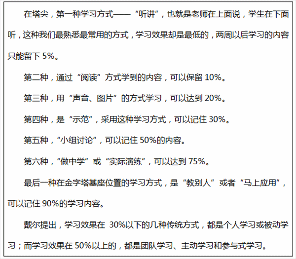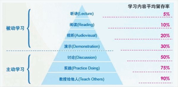 美國學者戴爾曾對“哪一種教學方法最能讓學生保持記憶”這一命題進行過研究,由此繪制了一幅著名的“學習金字塔”,我們可以參考一下。