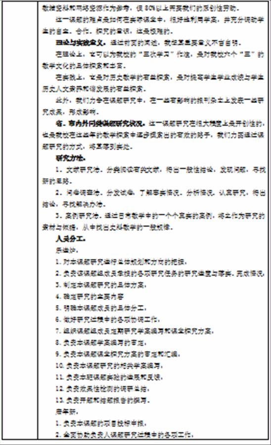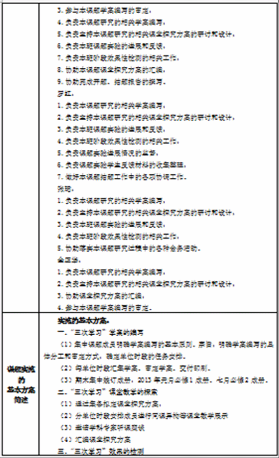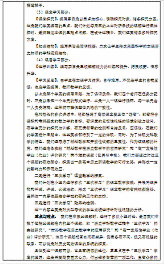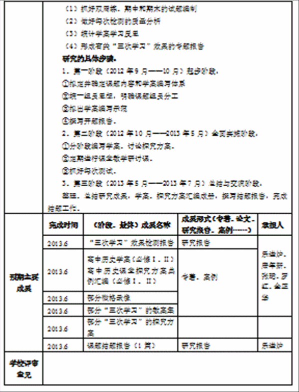 為此,此次課題申報我們準備研究三個課題,即“歷史學科教學過程中‘三次學習’的實驗研究”(詳見附件3)、“材料教學在歷史教學中的應用研究”和“高一發展性學業(作業)評價研究”。這三個課題相互之間有差異,側重各有不同,但又有很強的聯系,可以說是對歷史高效課堂的系統的探索。