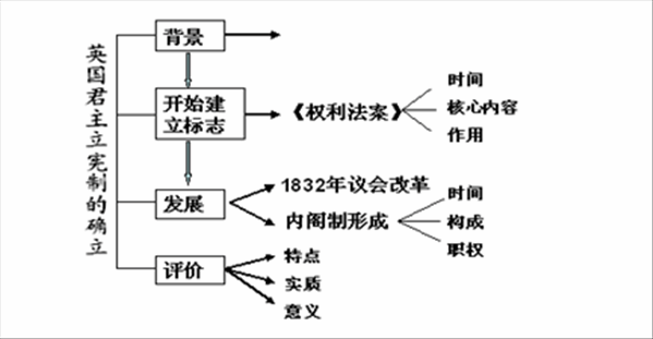 課堂部分由【課堂探究】和【知識結構】組成,前者編寫最核心的問題是明確探究對象,這是我們學案編寫的另一重點,將力圖準確定位探究對象,設計科學實用的探究步驟,是師生在課堂上共同探究的平臺,;后者編寫宗旨是簡明扼要,力求讓學生形成完整科學的本課歷史知識的學科邏輯結構。比如在《第7課 英國君主立憲制的確立》中,我們圍繞“君主立憲制的確立”這一中心問題設計以下探究環節:1、確立條件2、形成過程(確立和發展)3、特點和影響。學案課堂探究重在提出問題、指導方法,也提供若干經典材料,具體探究實施步驟將會編入教師用《課堂探究方案》中。最后在【課堂探究】中形成如下知識結構