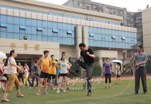 比賽按年級分場進行。比賽時間為3分鐘,以在單位時間內魚貫而進的人數最多者為勝。賽場上,老師們抖落了周考和高考備考的緊張,卸下平日的凝重和嚴肅,在五月的艷陽下放松身心,投入到緊張有趣的比賽中。那一個個騰空躍起的身影,猶如一只只輕盈欲飛的鳶鳥,給肅靜的校園增添了一抹靈動的色彩。比賽場面氣氛熱烈,歡聲笑語不絕于耳……比賽結束后,高一年級組以3分鐘200人次的成績獲得第一名。