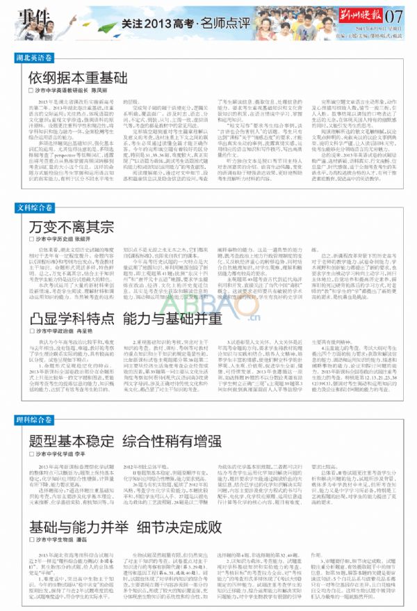 《荊州晚報(bào)》6月9日第7版:關(guān)注2013年高考.名師點(diǎn)評(píng)