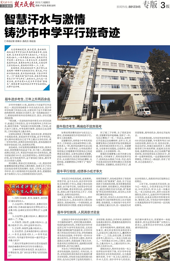 《楚天民報》7月3日第3版:智慧汗水與激情鑄沙市中學平行班奇跡
